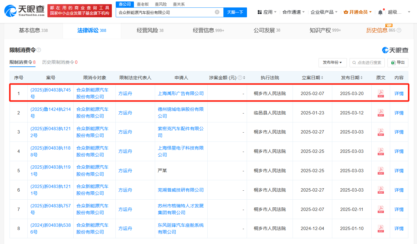 天眼查深度风险信息显示,3月20日,哪吒汽车关联公司合众新能源汽车股份有限公司及其法定代表人方运舟新增一条限制消费令,申请人为上海禹形广告有限公司,执行法院为桐乡市人民法院。此前,该公司及方运舟已多次被限制高消费。