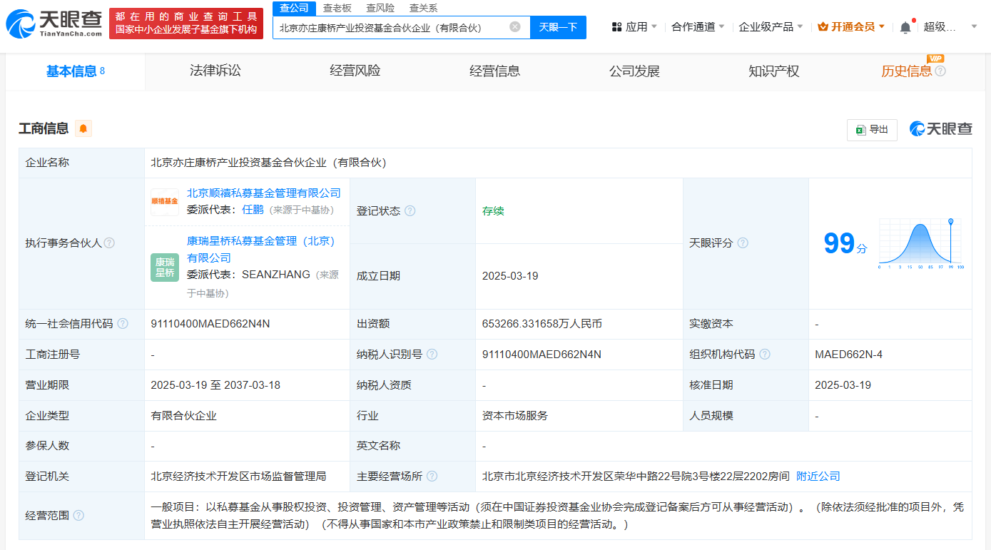 天眼查App显示,近日,北京亦庄康桥产业投资基金合伙企业(有限合伙)成立,执行事务合伙人为北京顺禧私募基金管理有限公司、康瑞星桥私募基金管理(北京)有限公司,出资额约65.3亿人民币,经营范围包括以私募基金从事股权投资、投资管理、资产管理等活动。合伙人信息显示,该基金由北京国有资本运营管理有限公司、北京亦庄国际生物医药投资管理有限公司、康瑞星桥私募基金管理(北京)有限公司、北京顺禧私募基金管理有限公司共同出资。