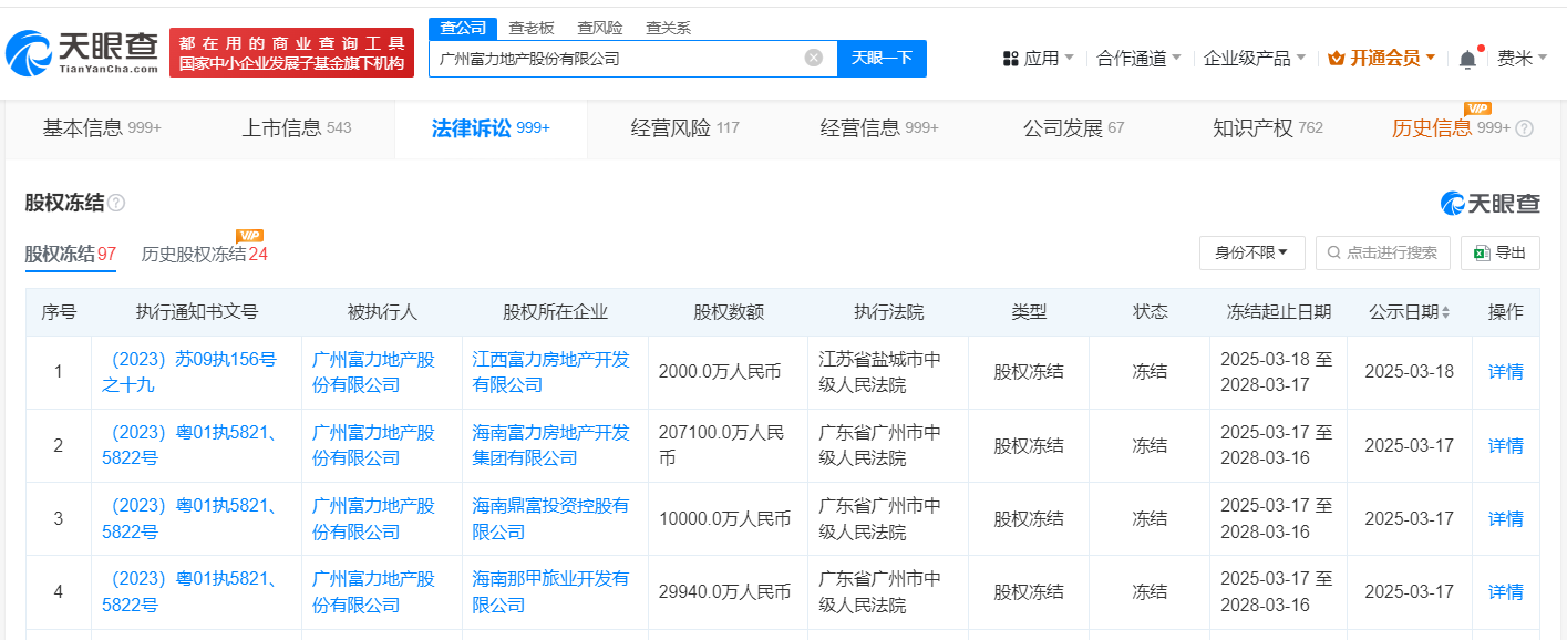 天眼查深度风险信息显示,近日,富力地产(HK.02777)新增4条股权冻结信息,股权所在企业分别为江西富力房地产开发有限公司、海南那甲旅业开发有限公司、海南鼎富投资控股有限公司、海南富力房地产开发集团有限公司,冻结股权数额合计24.9亿余元,冻结期限均为三年,执行法院为广东省广州市中级人民法院、江苏省盐城市中级人民法院。
