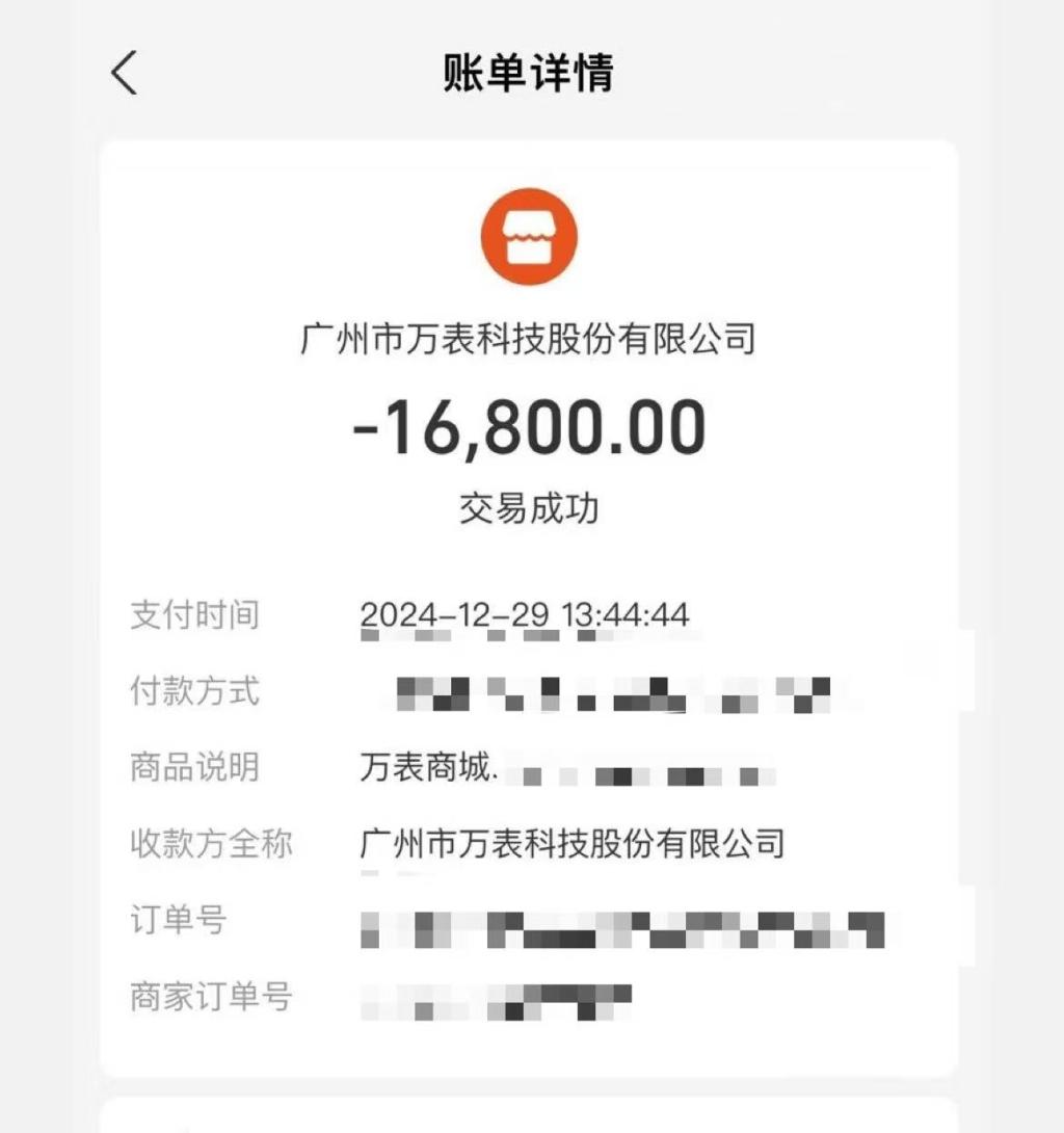 袁先生称,他于2024年12月29日在万表APP下单了一款雷达(Rado)-True真系列手表,实付款为16800元。“当时平台客服跟我说可能三天左右就发货,但是过了三天后又跟我说,这个是明星代言款,要等七到十天。”
