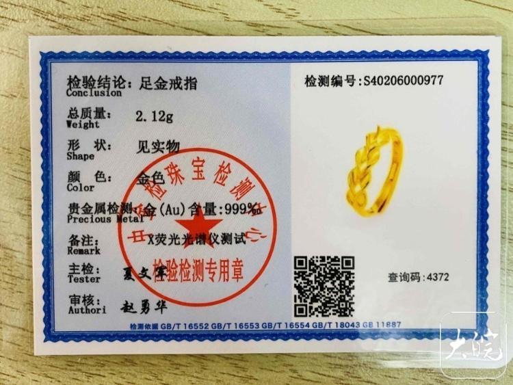 宣称“足金戒指”并附有鉴定证书,为何里面却呈现银色?3月20日,大皖新闻记者从范女士提供的“佰福意珠宝” 鉴定证书中看到,上面印有一个名为“中金检珠宝检测中心”的公章,还有一个二维码,并附有检测编号和查询码。