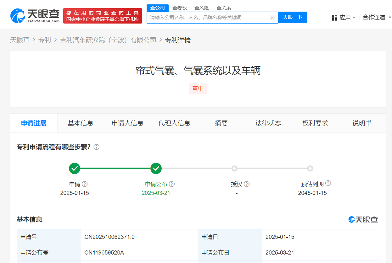天眼查财产线索信息显示,近日,浙江吉利控股集团有限公司、吉利汽车研究院(宁波)有限公司申请的“帘式气囊、气囊系统以及车辆”专利公布。