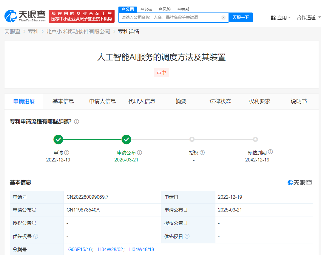 天眼查财产线索信息显示,近日,北京小米移动软件有限公司申请的“人工智能AI服务的调度方法及其装置”专利公布。