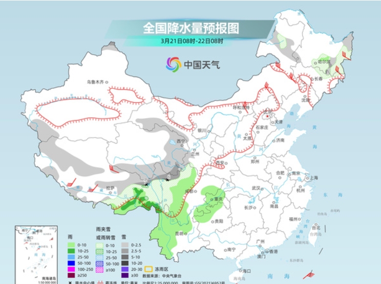 今起三天,我国还将维持雨雪稀少的格局,青藏高原东部和西南地区多阴雨雪天气。