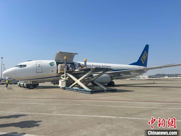 中国邮政航空CF251货机航班正在装载华南邮政航空国际枢纽中心首批出口货物。关芸 摄