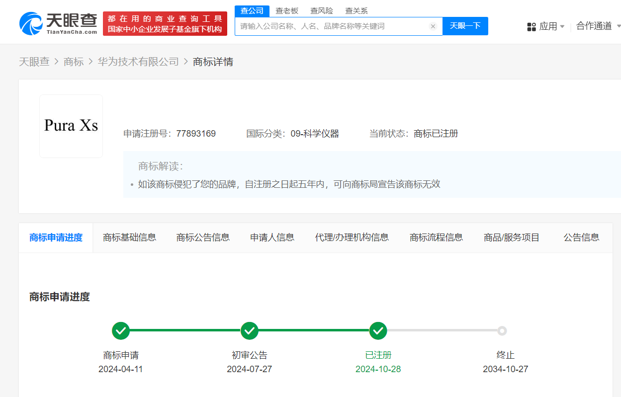 天眼查知识产权信息显示,2024年4月,华为技术有限公司已申请“Pura X”“Pura Xs”商标,国际分类为科学仪器,上述商标已于2024年10月成功注册。值得一提的是,华为技术有限公司还申请注册了多个Pura系列商标,包括“Pura V”“Pura E”“Pura F”“Pura Plus”等。