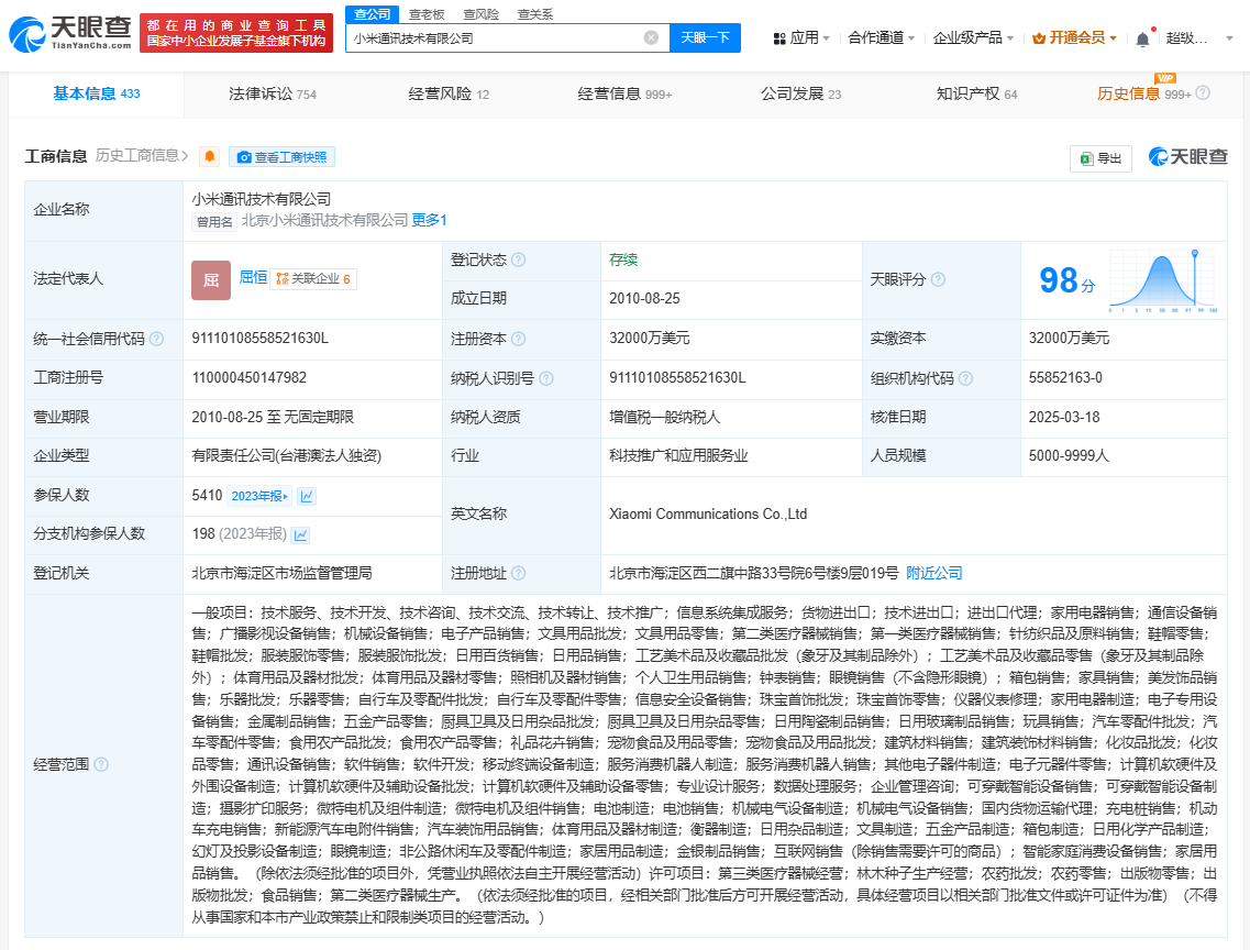 该公司成立于2010年8月,法定代表人为屈恒,注册资本3.2亿美元,经营范围包括通信设备销售、广播影视设备销售、机械设备销售、电子产品销售等,由Xiaomi H.K. Limited全资持股。据报道,近期,小米汽车旗下的SU7 Ultra车型因其独特的24K金碳纤维车标在网络上引发了广泛关注。