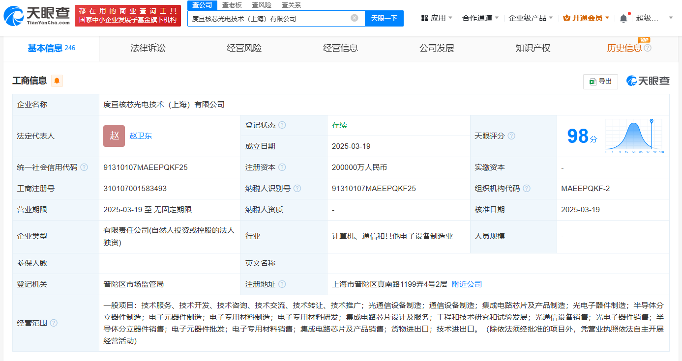 天眼查App显示,近日,度亘核芯光电技术(上海)有限公司成立,法定代表人为赵卫东,注册资本20亿人民币,经营范围包括光通信设备制造、通信设备制造、集成电路芯片及产品制造、光电子器件制造等。股东信息显示,该公司由度亘核芯光电技术(苏州)股份有限公司全资持股。