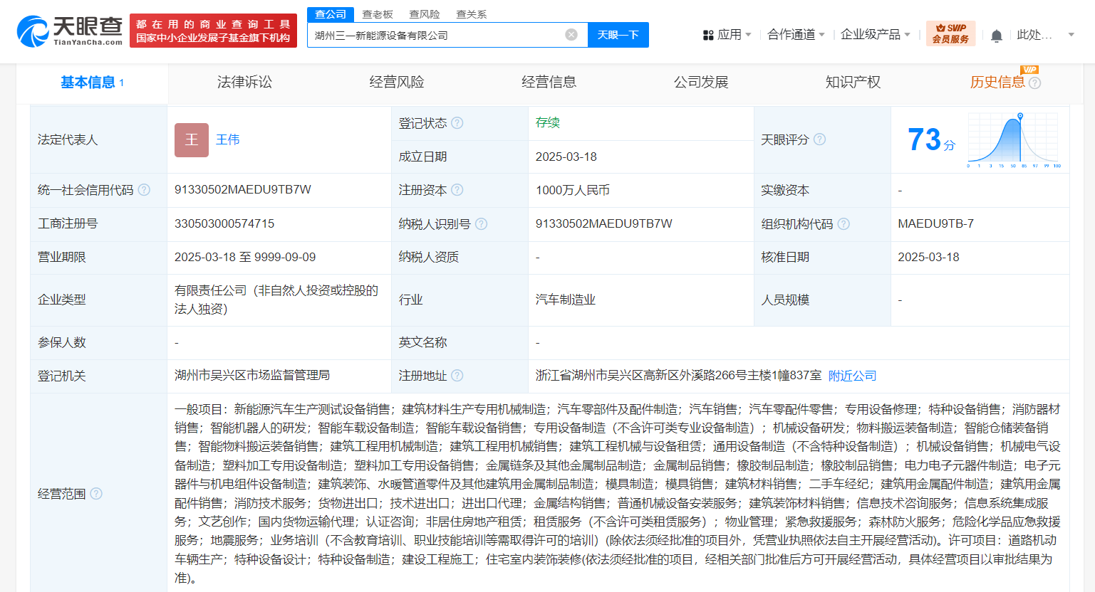 天眼查App显示,近日,湖州三一新能源设备有限公司成立,法定代表人为王伟,注册资本1000万人民币,经营范围含新能源汽车生产测试设备销售、建筑材料生产专用机械制造、汽车零部件及配件制造、汽车销售、汽车零配件零售、专用设备修理、特种设备销售、智能机器人的研发、智能车载设备制造等。股权全景穿透图显示,该公司由三一汽车制造有限公司全资持股,后者为三一重工(600031)全资子公司。