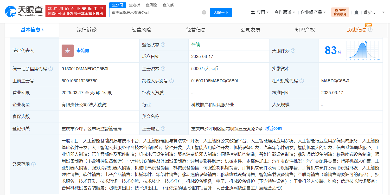 天眼查App显示,近日,重庆凤凰技术有限公司成立,法定代表人为朱乾勇,注册资本5000万人民币,经营范围含人工智能基础资源与技术平台、人工智能理论与算法软件开发、人工智能公共数据平台、软件开发、机械设备研发、汽车零部件研发、智能机器人的研发、信息系统集成服务等。股东信息显示,该公司由赛力斯(601127)全资持股。