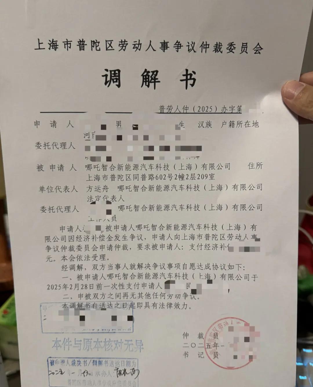 另一与哪吒智合新能源汽车科技(上海)有限公司(合众新能源子公司,以下简称“哪吒智合”)签订劳动合同的杨先生已拿到了上海市普陀区劳动人事争议仲裁委员会调解书,该调解书显示,双方当事人就解决争议事项自愿达成协议,哪吒智合将于2025年2月28日前一次性付清杨先生6万余元。