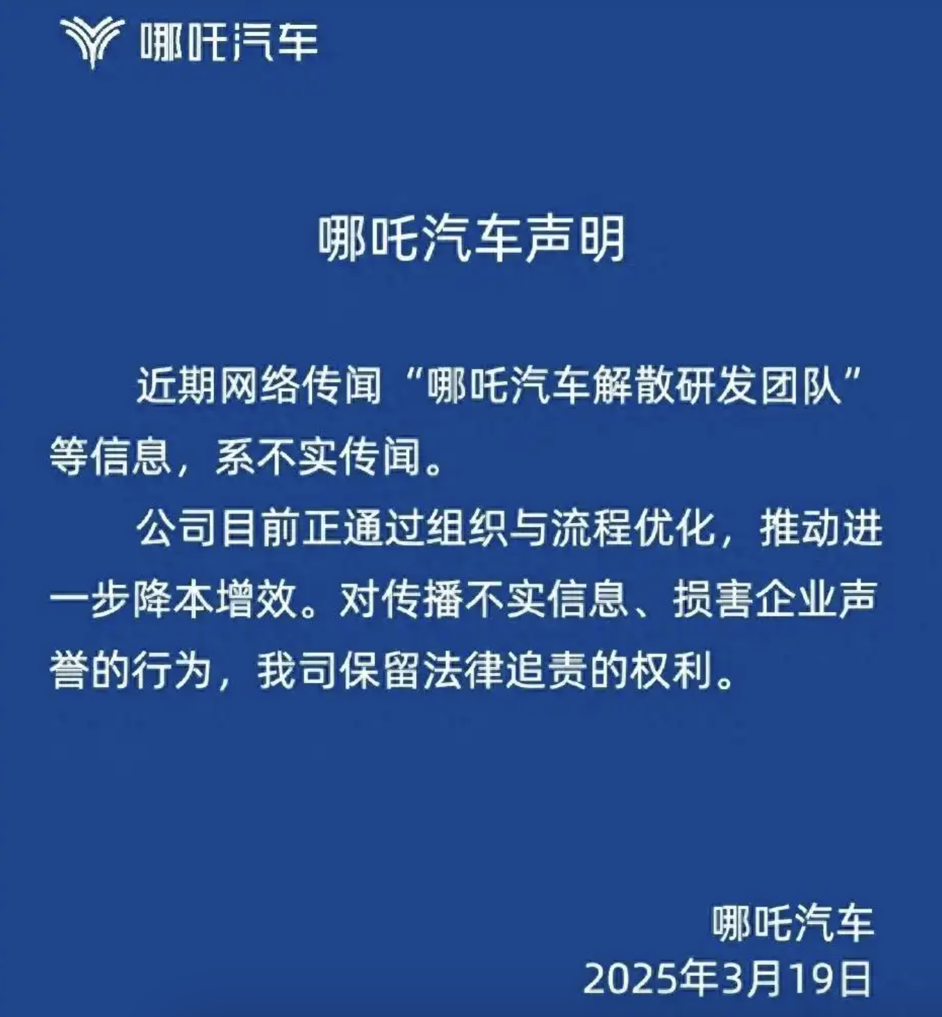 3月19日,哪吒汽车官方微博号发文称:近期网络传闻“哪吒汽车解散研发团队”等信息,系不实传闻。公司目前正通过组织与流程优化,推动进一步降本增效。对传播不实信息、损害企业声誉的行为,我司保留法律追责的权利。