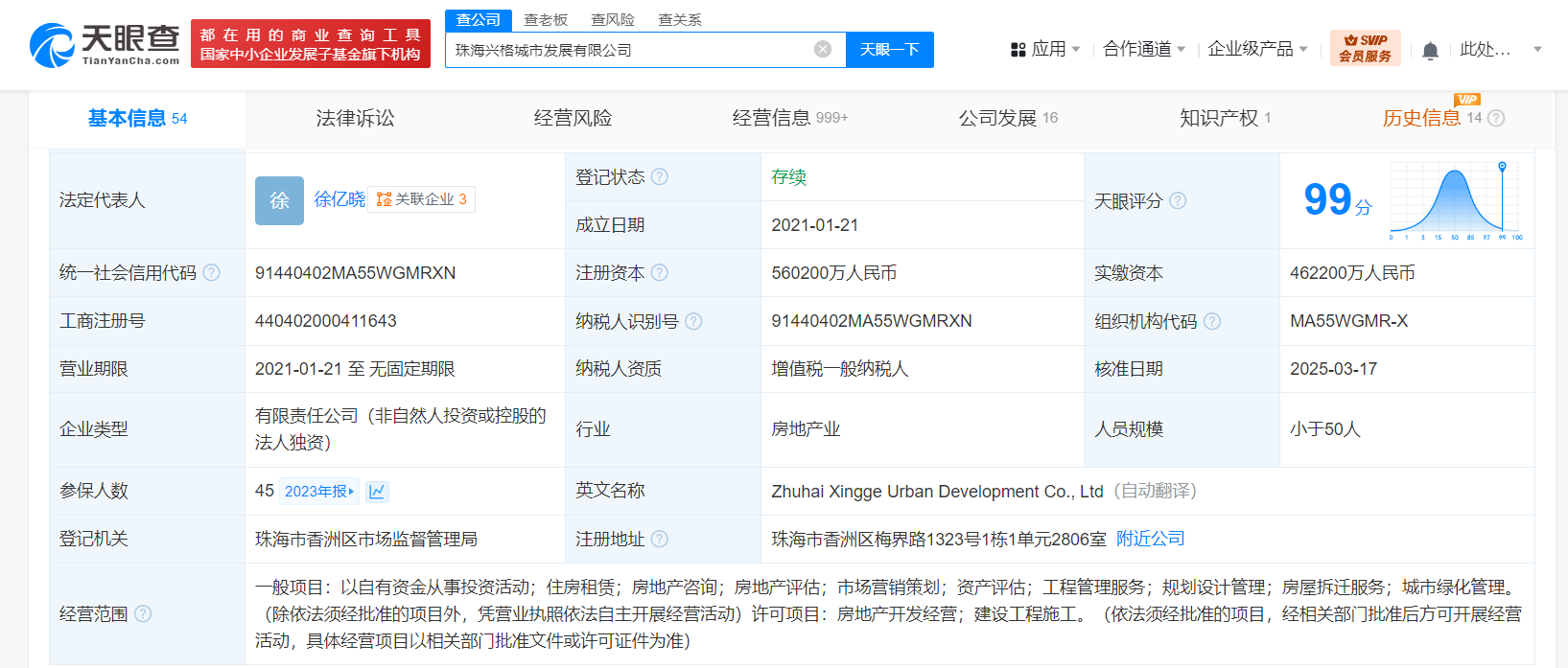 天眼查App显示,近日,珠海兴格城市发展有限公司发生工商变更,注册资本由46.22亿人民币增至56.02亿人民币,增幅约21%,同时,部分主要人员也发生变更。