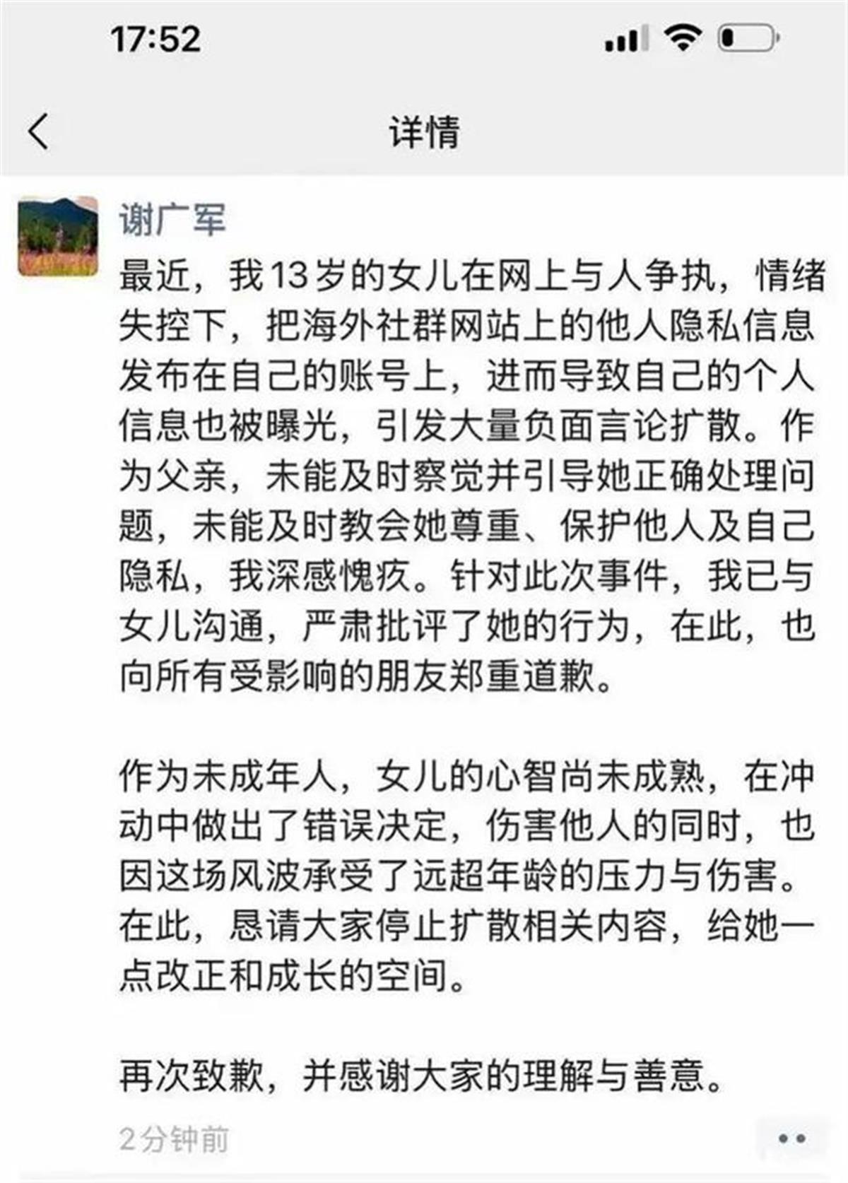 “受影响”和“受害”性质完全不同。虽然说,他的女儿还未成年,但作为监护人有监护之责,应该承担相应的民事责任,首先就是要向受害者致歉。然而,在相关内容里,谢广军对女儿就是“严厉批评”了事,并且树立其女儿也是“受害人”的形象。客观来说,这让不少网友感觉不太舒服。因为这太过于轻描淡写了。另外,其将女儿多次“开盒”行为称为“情绪失控”,问题是谁又先伤害了她呢?