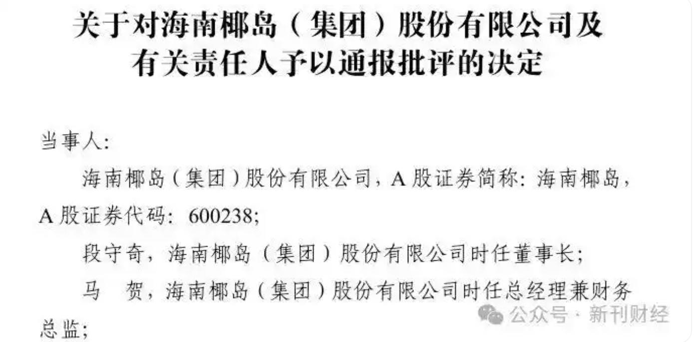 在马贺代行海南椰岛财务总监期间,公司财务信息披露方面似乎问题突出。2024年6月17日,因公司未及时披露员工职务侵占资金事项,上交所发布纪律处分决定书,对海南椰岛公司及马贺等相关责任人给予通报批评,并记入资本市场诚信档案。