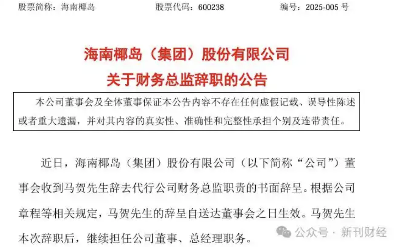 3月17日,海南椰岛发布重要人事调整公告显示,马贺主动提交辞呈,不再担任公司代行财务总监职务,但将继续保留董事及总经理的职位。