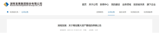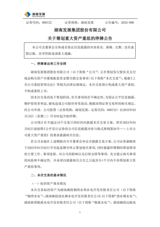 3月18日,湖南发展发布公告,正在筹划发行股份及支付现金购买资产并募集配套资金暨关联交易事项。公司股票自2025年3月19日开市时起开始停牌。