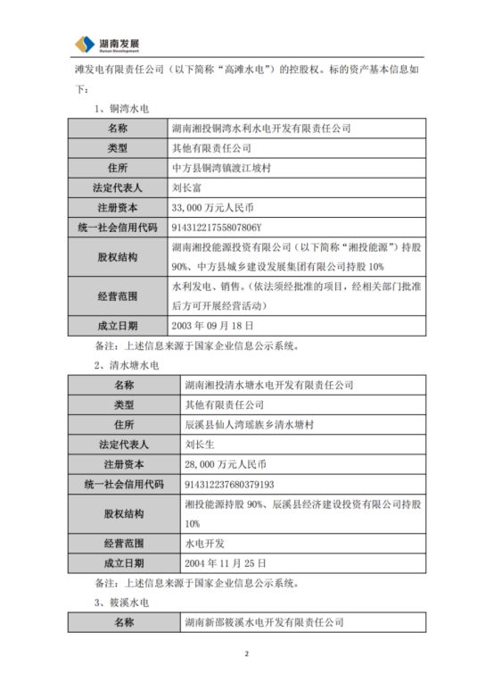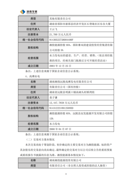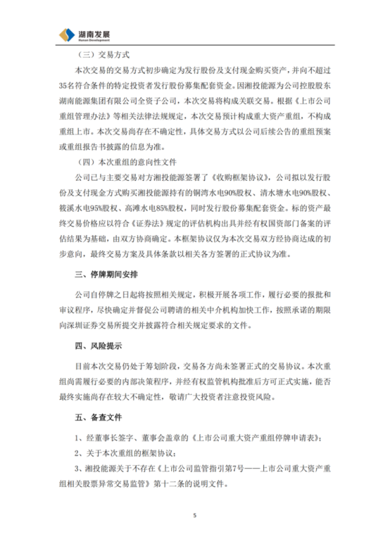公告称,公司已与主要交易对方湘投能源签署了《收购框架协议》,拟以发行股份及支付现金方式购买湘投能源持有的铜湾水电90%股权、清水塘水电90%股权、筱溪水电95%股权、高滩水电85%股权,同时发行股份募集配套资金。根据《上市公司重组管理办法》等相关法律法规规定,本次交易预计构成重大资产重组,不构成重组上市。