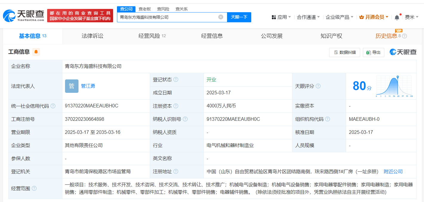 天眼查App显示,近日,青岛东方海盛科技有限公司成立,法定代表人为管江勇,注册资本4000万人民币,经营范围包括机械电气设备制造、机械电气设备销售、家用电器零配件销售、家用电器制造、家用电器销售、通用零部件制造等,由东方电热(300217)、海尔集团旗下青岛经济技术开发区海尔热水器有限公司、青岛东方海盛管理咨询合伙企业(有限合伙)共同持股。