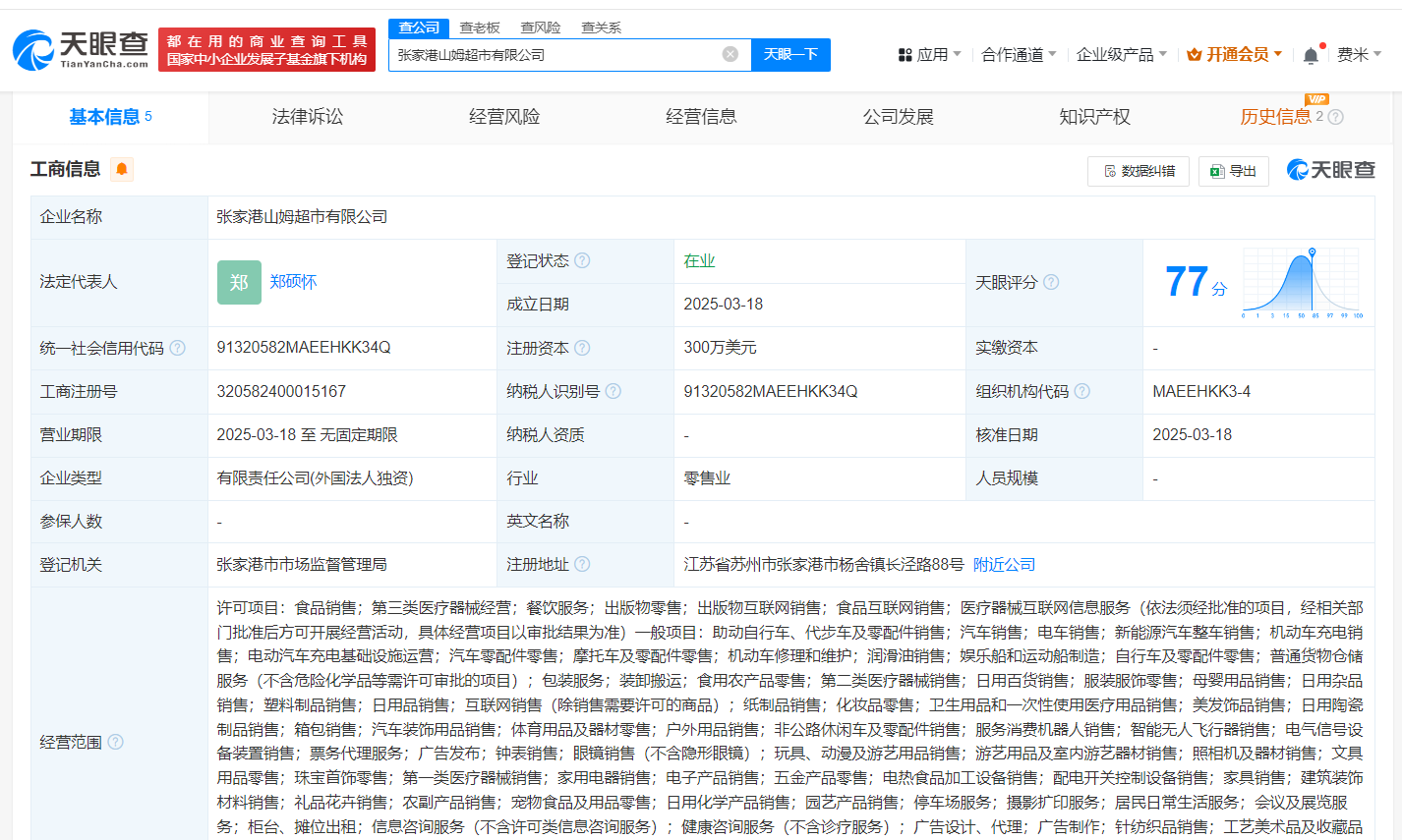 天眼查App显示,近日,张家港山姆超市有限公司成立,法定代表人为郑硕怀,注册资本300万美元,经营范围包括食品销售、第三类医疗器械经营、餐饮服务、出版物零售、出版物互联网销售、电动汽车充电基础设施运营等,由山姆(上海)投资有限公司全资持股。值得一提的是,今年以来,山姆(上海)投资有限公司已在北京、扬州、广州等多地成立新公司。