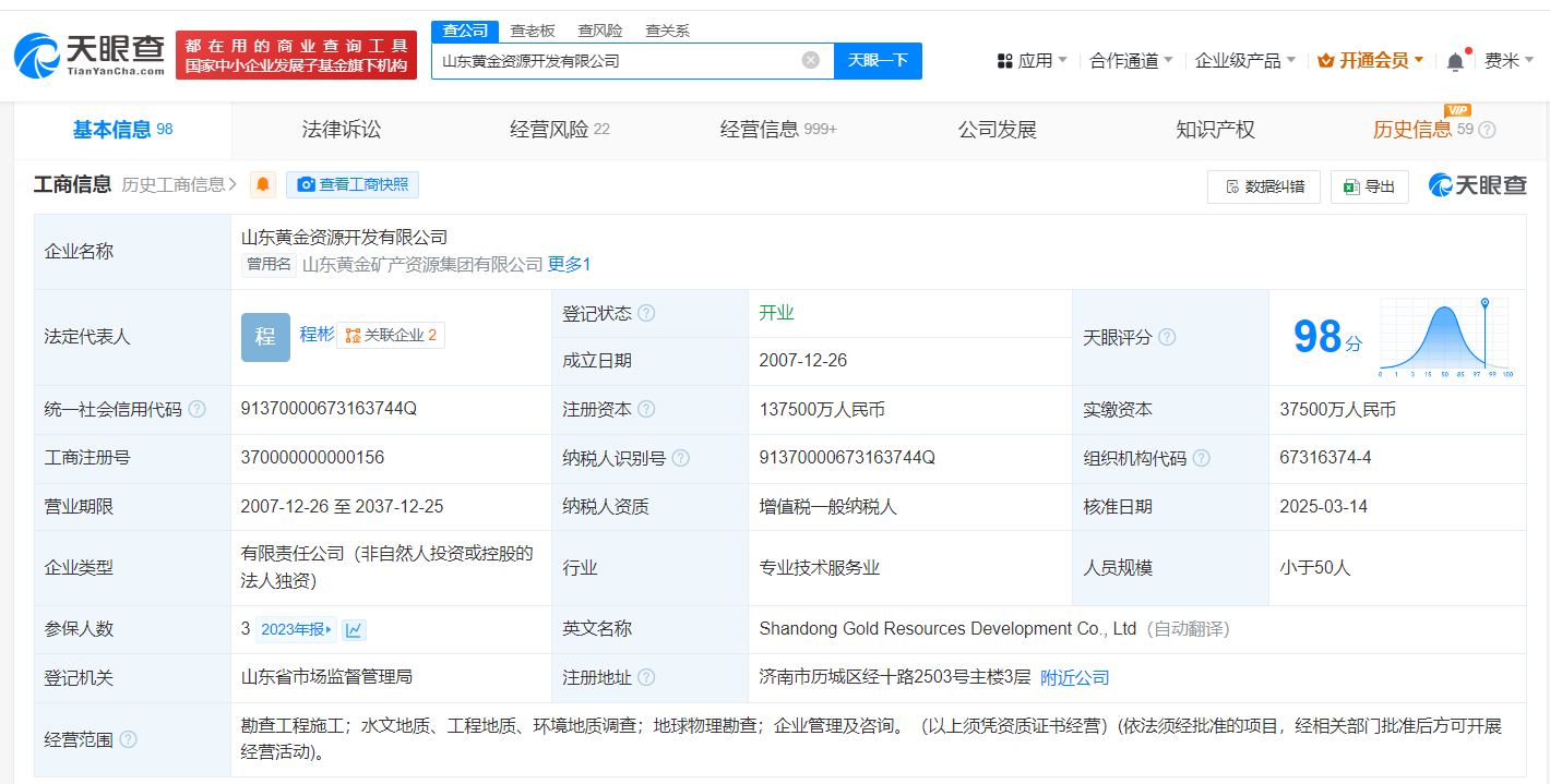 该公司成立于2007年12月,法定代表人为程彬,经营范围为勘查工程施工,水文地质、工程地质、环境地质调查,地球物理勘查,企业管理及咨询,由山东黄金集团有限公司全资持股。