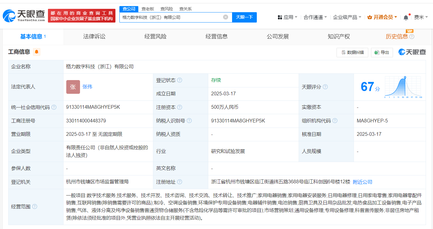 天眼查App显示,近日,格力数字科技(浙江)有限公司成立,法定代表人为张伟,注册资本500万人民币,经营范围包括数字技术服务、家用电器销售、家用电器安装服务、日用电器修理、日用家电零售、通用设备修理等。股权全景穿透图显示,该公司由珠海格力数字科技有限公司全资持股,后者为格力电器(000651)全资子公司。