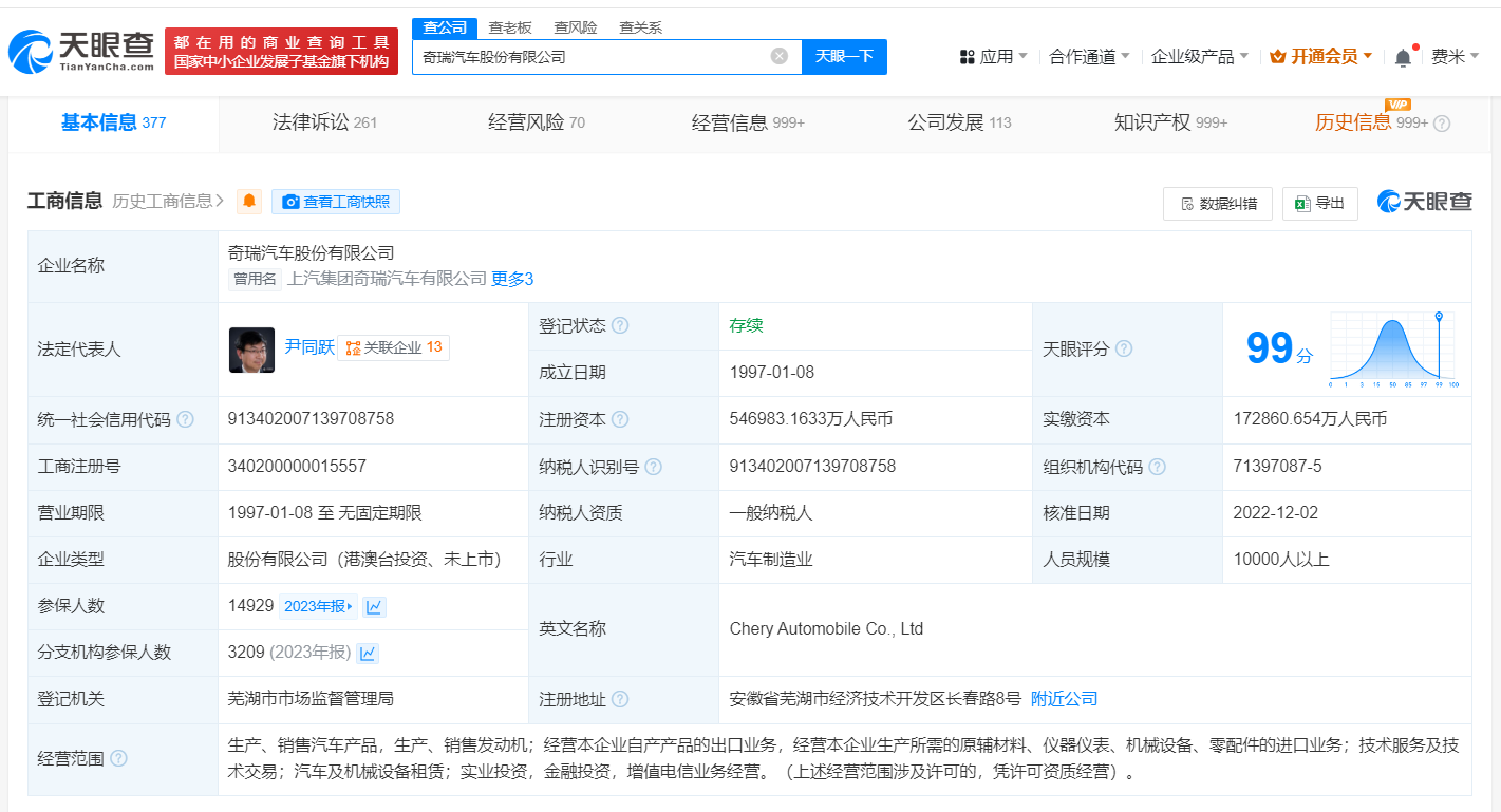 奇瑞汽车股份有限公司成立于1997年1月,法定代表人为尹同跃,注册资本约54.7亿人民币,由奇瑞控股集团有限公司、安徽省信用融资担保集团有限公司、芜湖市投资控股集团有限公司等共同持股。