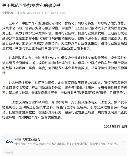 今日,中国汽车工业协会发布《关于规范企业数据发布的倡议书》(以下简称“倡议书”),倡议企业停止对外发布销量周榜,避免使用对比性表述,发布关联性排名等内容,共同维护公平竞争环境,引导行业自律,促进行业健康发展。