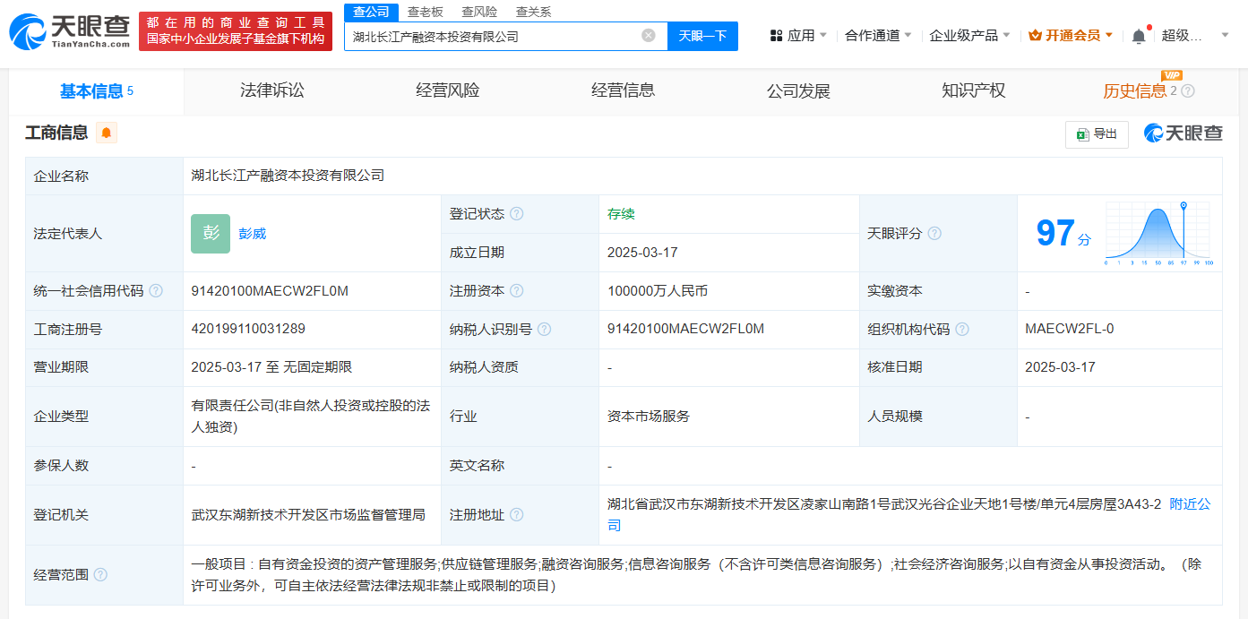 天眼查App显示,近日,湖北长江产融资本投资有限公司成立,法定代表人为彭威,注册资本10亿人民币,经营范围包括自有资金投资的资产管理服务、供应链管理服务、融资咨询服务等。股东信息显示,该公司由长江产业投资集团有限公司全资持股。