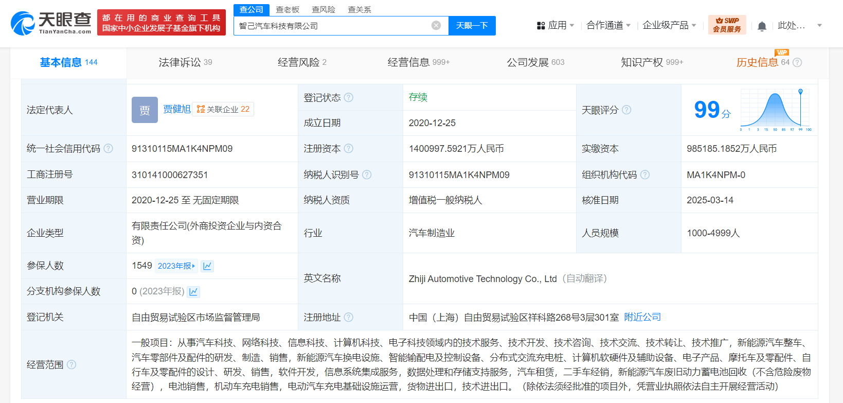 智己汽车科技有限公司成立于2020年12月,法定代表人为贾健旭,经营范围含从事汽车科技、网络科技、信息科技、计算机科技、电子科技领域内的技术服务、技术开发、技术咨询、技术交流、技术转让、技术推广,新能源汽车整车、汽车零部件及配件的研发、制造、销售等。股东信息显示,该公司现由上汽集团(600104)及旗下上海元界智能科技股权投资基金合伙企业(有限合伙)、阿里巴巴旗下杭州灏月企业管理有限公司及上述新增股东等共同持股。
