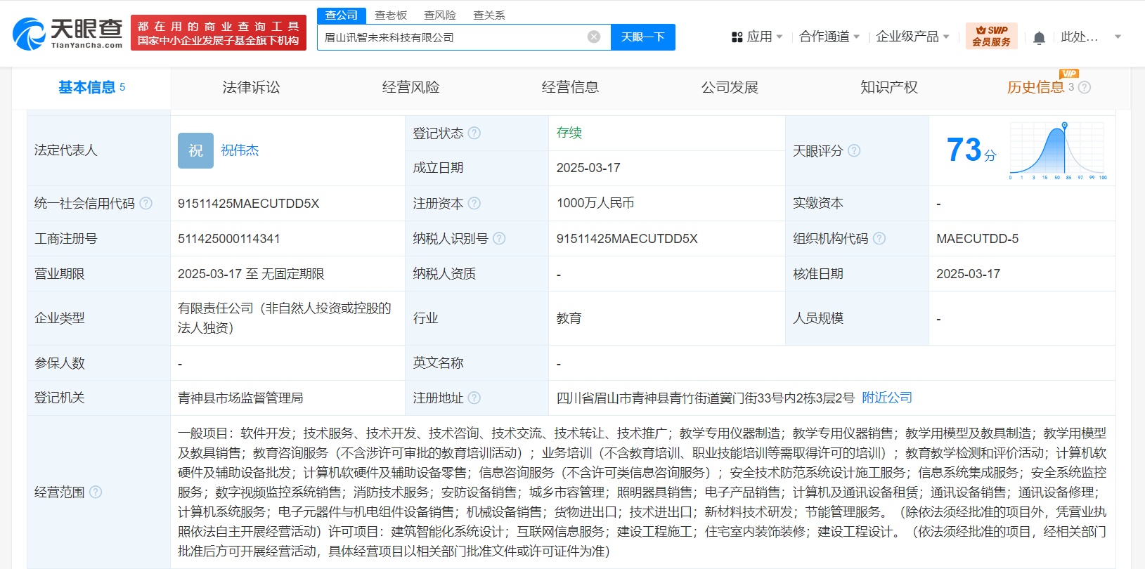 天眼查App显示,3月17日,四川绵阳游讯科技有限公司、眉山讯智未来科技有限公司成立,法定代表人均为祝伟杰,注册资本均为1000万人民币,经营范围均包含教学专用仪器销售、教学用模型及教具销售、计算机软硬件及辅助设备零售、信息系统集成服务、消防技术服务、电子产品销售等。股东信息显示,上述两公司均由科大讯飞(002230)全资持股。