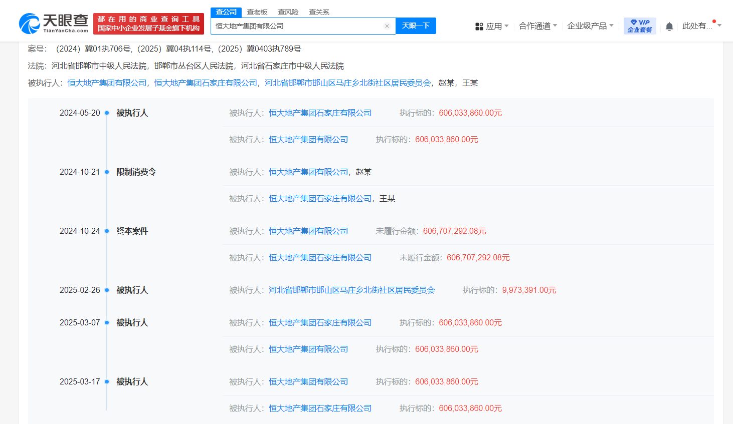 天眼查法律诉讼信息显示,3月17日,恒大地产集团有限公司新增7条被执行人信息,执行标的合计6.6亿余元,涉及金融借款合同纠纷、票据纠纷等案件,部分案件被执行人还包括恒大地产集团石家庄有限公司、恒大集团有限公司等,执行法院为邯郸市丛台区人民法院、广东省揭阳市中级人民法院等。