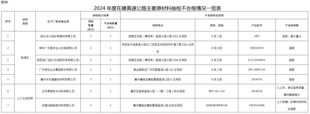 附件内容显示,主要原材料抽检不合格的共有7组,分别为5组粉煤灰和2组土工合成材料。不合格的粉煤灰来自阳江市大地环保建材有限公司、神华广东国华台山发电有限公司、阳西电厂(阳江市鸿跃贸易有限公司)、广州恒运企业集团股份有限公司、惠州市东耀建筑材料有限公司。不合格的土工合成材料来自江苏景程防水材料有限公司(不合格参数:土工布的单位面积质量、横向撕破强力)、安徽创皖新型材料有限公司(不合格参数:土工格栅的纵横向标称抗拉强度)。