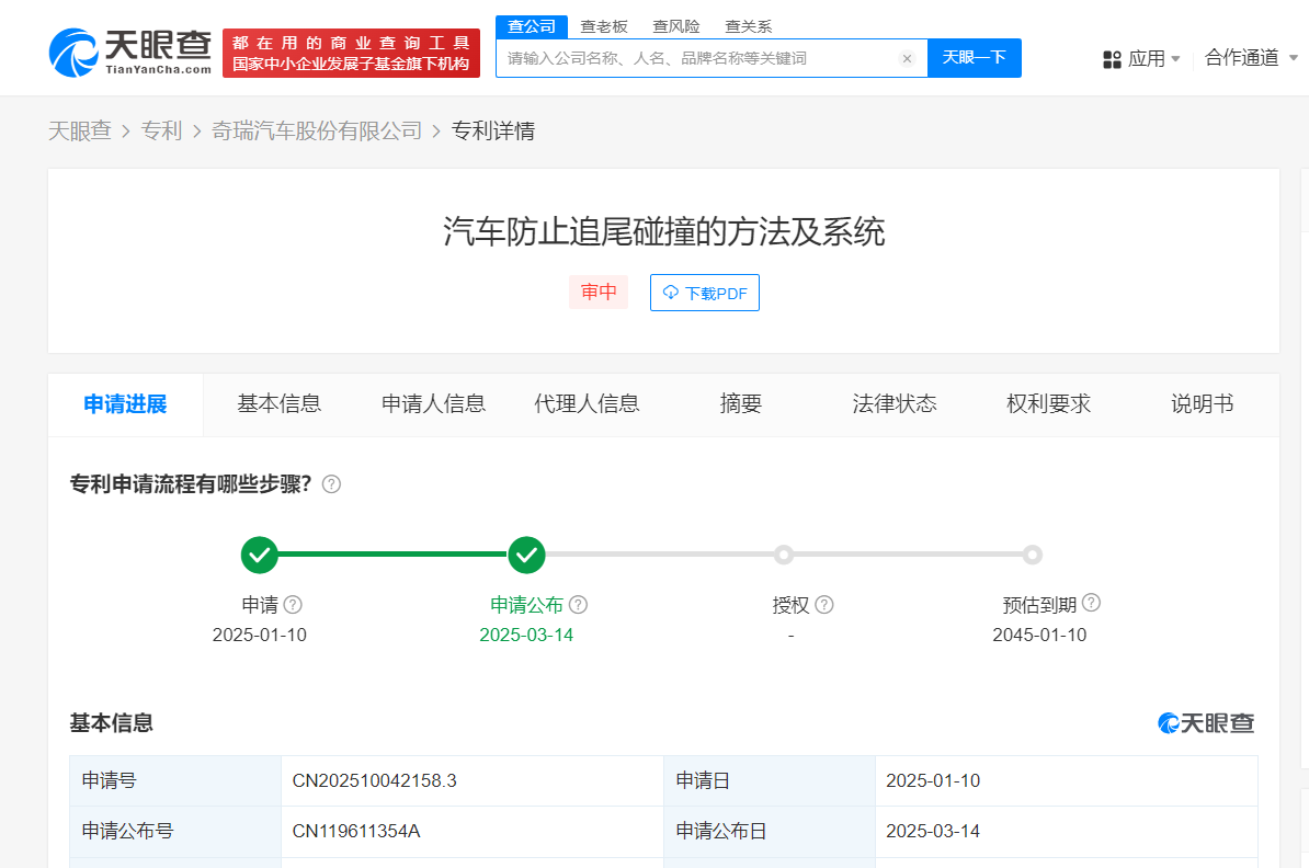 天眼查财产线索信息显示,近日,奇瑞汽车股份有限公司申请的“汽车防止追尾碰撞的方法及系统”专利公布。