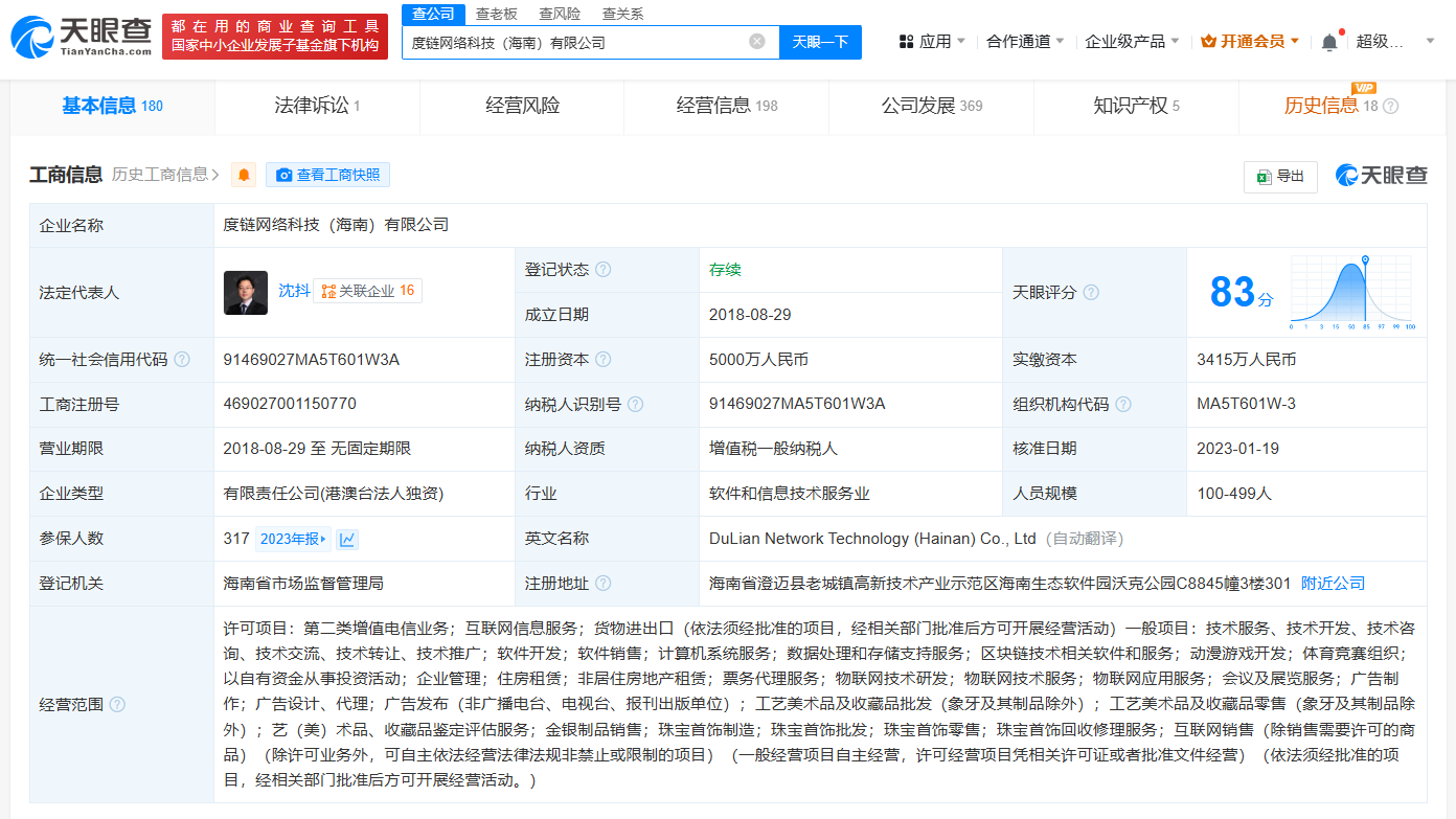 天眼查App显示,度链网络科技(海南)有限公司成立于2018年8月,法定代表人为沈抖,注册资本5000万人民币,经营范围包括互联网信息服务、数据处理和存储支持服务、区块链技术相关软件和服务等,由百度(香港)有限公司全资持股。