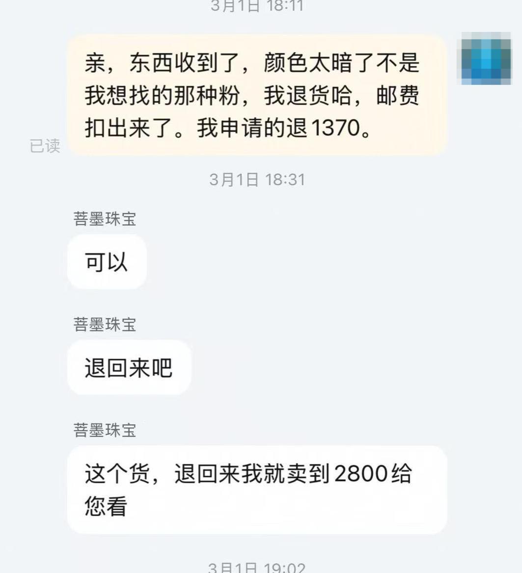戴女士说,第一次退货时,商家话语间有些不悦。当时她说邮费自己出,申请退1370,没想到商家回复“可以。这个货退回来,我就卖到2800给你看”。而当她第二次退货时,商家直接表示“收不起就不要收”。