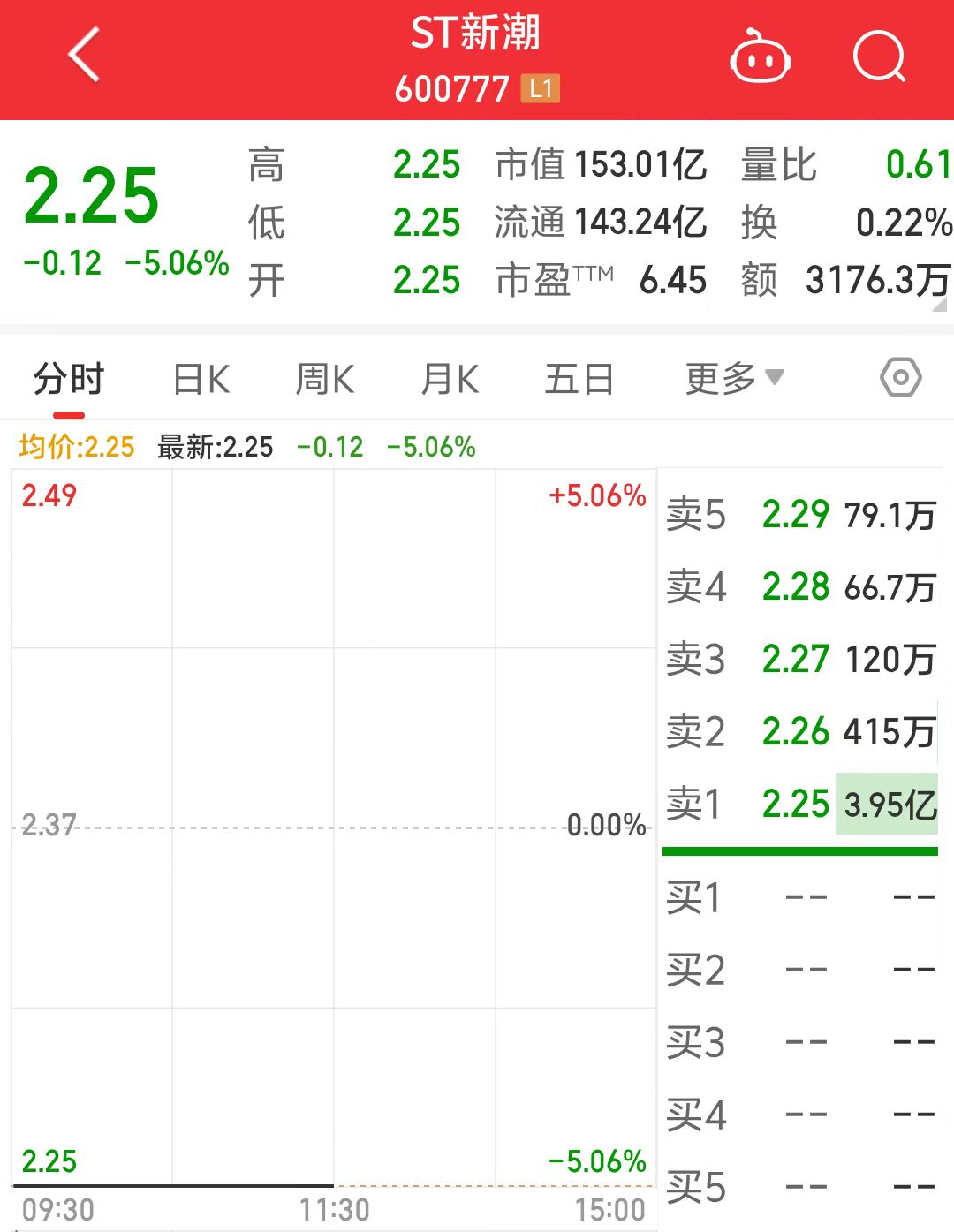 3月17日,st新潮(新潮能源,600777.SH)开盘一字跌停,截至早盘收盘,封单金额近4亿元,报2.25元/股,总市值153亿元。