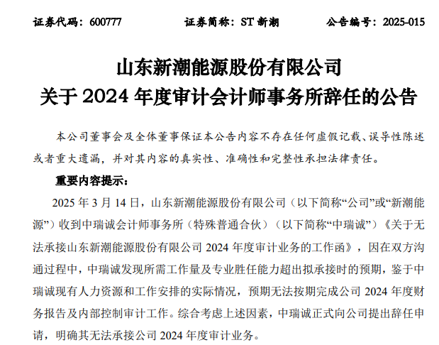 新潮能源在公告中也表示,因在双方沟通过程中,中瑞诚发现所需工作量及专业胜任能力超出拟承接时的预期,鉴于中瑞诚现有人力资源和工作安排的实际情况,预期无法按期完成公司2024年度财务报告及内部控制审计工作。综合考虑上述因素,中瑞诚正式向公司提出辞任申请,明确其无法承接公司2024年度审计业务。