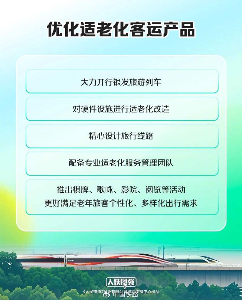 ● 三是优化适老化客运产品。大力开行满足老年旅客特定需求、以老年旅客为主要群体的银发旅游列车,对硬件设施进行适老化改造,精心设计旅行线路,配备专业适老化服务管理团队,推出棋牌、歌咏、影院、阅览等老年人喜爱的活动,更好满足老年旅客个性化、多样化出行需求。