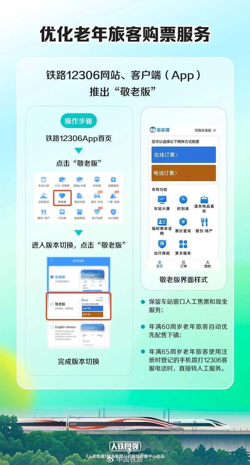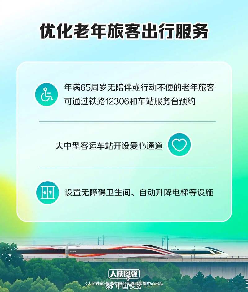 ● 二是优化老年旅客出行服务。持续优化完善特殊重点旅客服务,年满65周岁无陪伴或行动不便的老年旅客,可通过铁路12306和车站服务台预约,铁路部门将提供专区候车、引导帮扶等服务;在大中型客运车站开设爱心通道,为老年旅客提供优先安检、验证服务;设置无障碍卫生间、自动升降电梯等设施,为行动不便的老年旅客乘车出行提供更多便利。