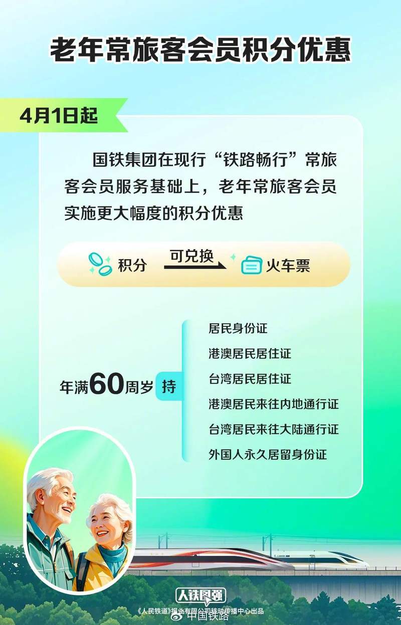据@中国铁路微博消息,4月1日起,国铁集团在现行“铁路畅行”常旅客会员服务基础上,对年满60周岁持居民身份证、港澳居民居住证、台湾居民居住证、港澳居民来往内地通行证、台湾居民来往大陆通行证、外国人永久居留身份证的老年常旅客会员实施更大幅度的积分优惠,积分可兑换火车票,将更好地满足老年旅客对美好旅行生活的向往,助力更多老年人去追寻“诗和远方”,进一步激发养老消费市场潜能,为促进银发经济发展、扩大服务消费注入新动能。