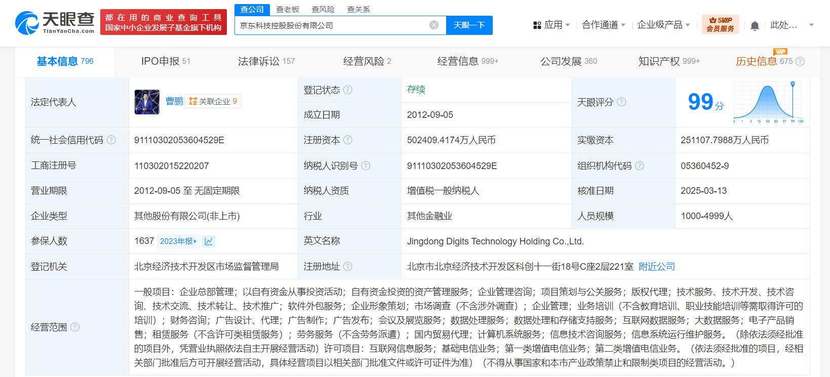 京东科技控股股份有限公司成立于2012年9月,法定代表人为曹鹏,董事长为刘强东,经营范围含企业总部管理、以自有资金从事投资活动、自有资金投资的资产管理服务、企业管理咨询、项目策划与公关服务等。股东信息显示,该公司由宿迁聚合数字企业管理有限公司、宿迁东泰锦荣投资管理中心(有限合伙)、刘强东等共同持股。