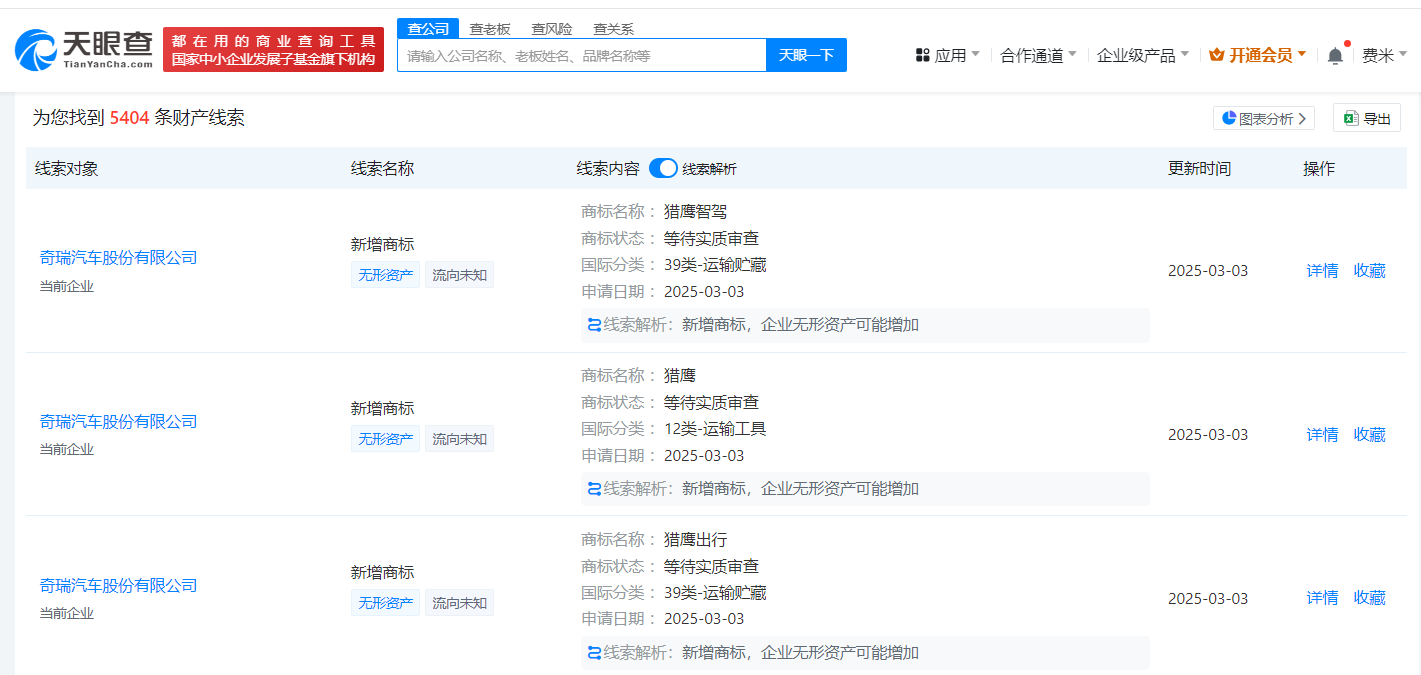 天眼查财产线索信息显示,近日,奇瑞汽车股份有限公司申请注册“猎鹰智驾”“猎鹰”“猎鹰出行”商标,国际分类为运输贮藏、运输工具,当前商标状态均为等待实质审查。