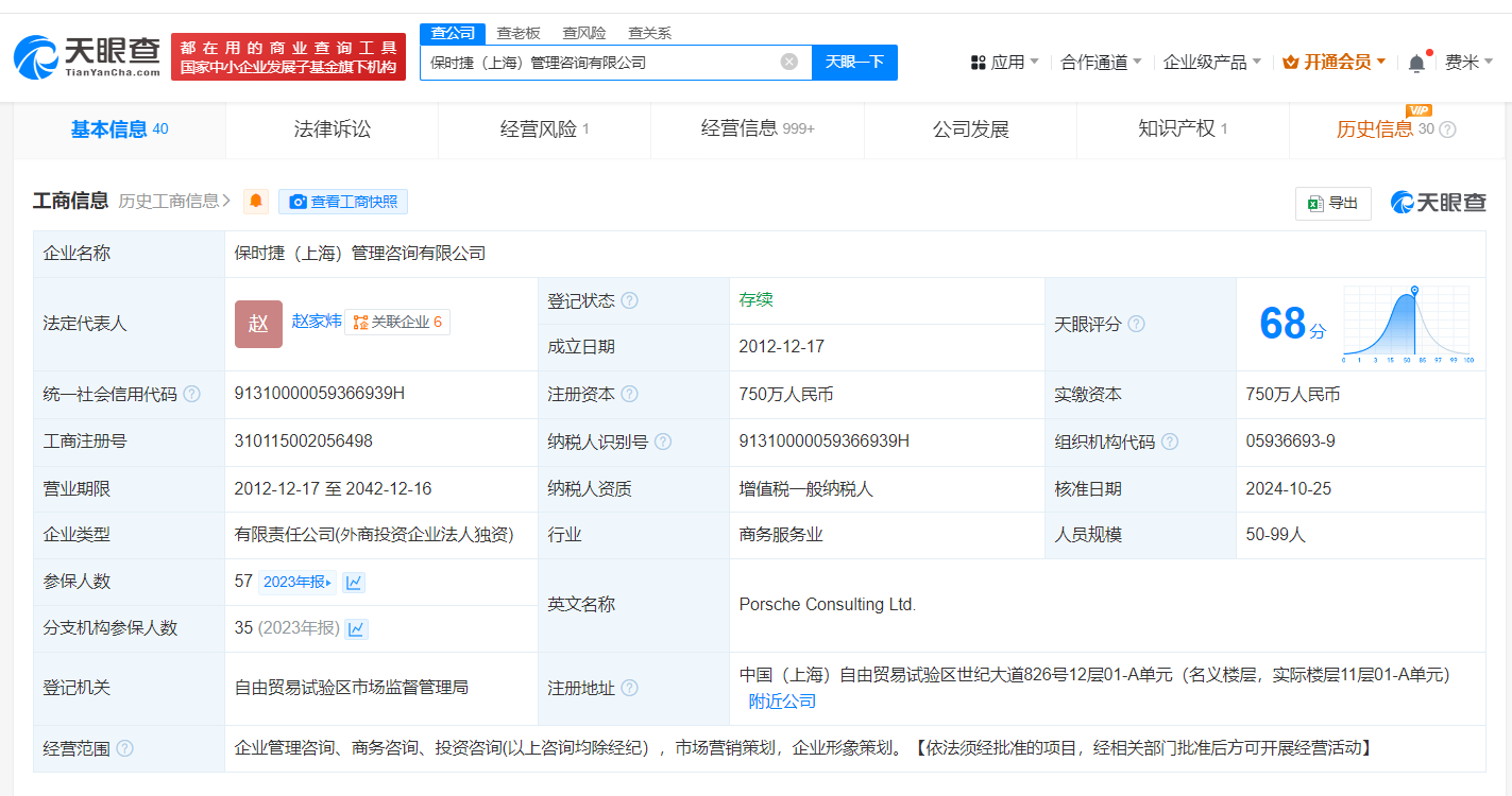 保时捷(上海)管理咨询有限公司成立于2012年12月,法定代表人为赵家炜,注册资本750万人民币,经营范围包括企业管理咨询、商务咨询、投资咨询等,由保时捷(中国)汽车销售有限公司全资持股。