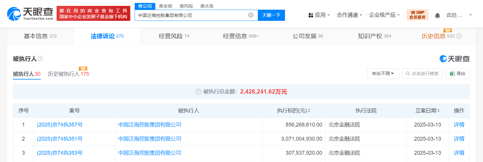 天眼风险信息显示,中国泛海控股集团有限公司现存30条被执行人信息,被执行总金额超242亿元。此外,该公司还存在多条股权冻结信息。