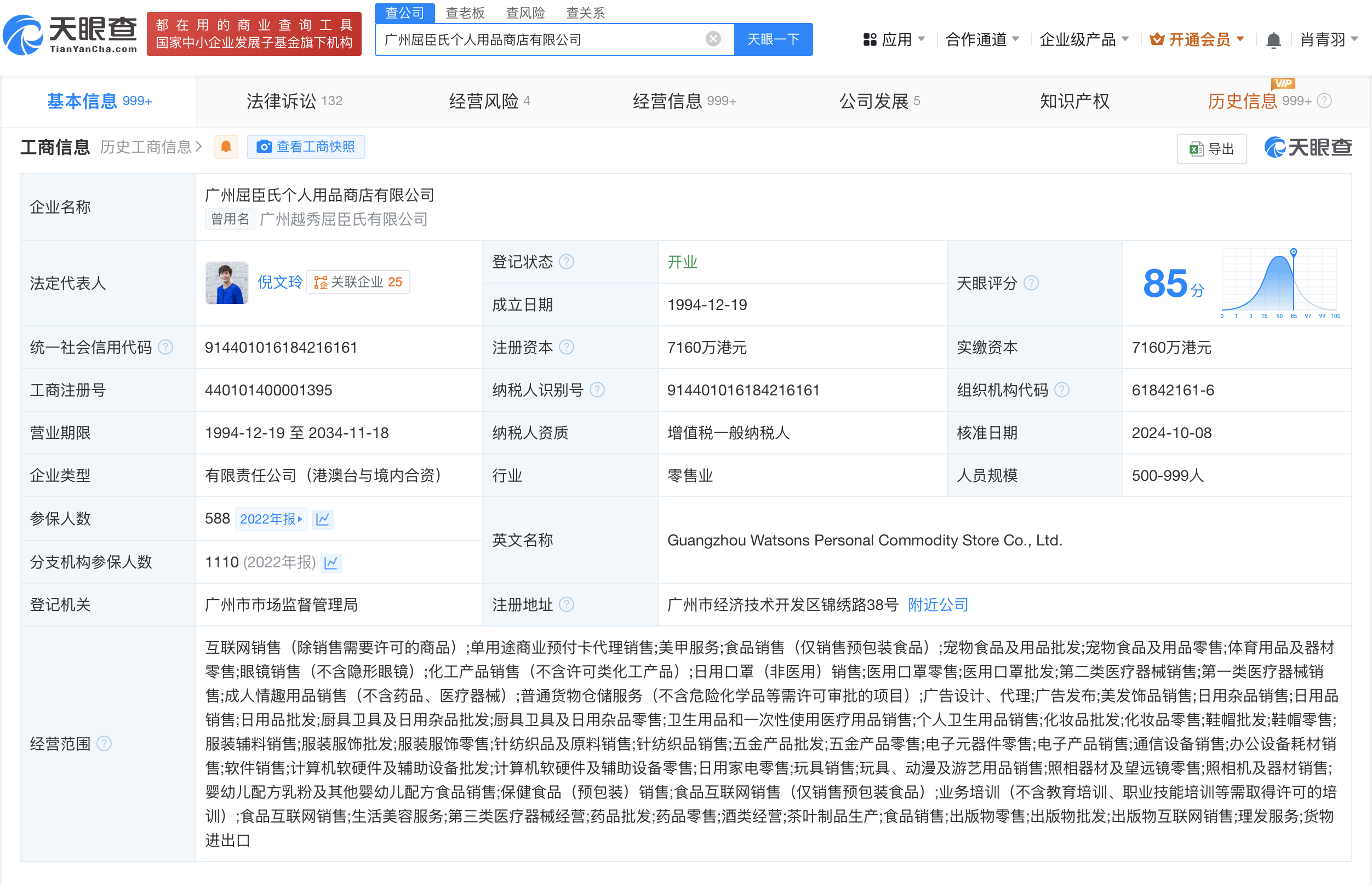 天眼查App显示,广州屈臣氏个人用品商店有限公司成立于1994年12月,法定代表人为倪文玲,注册资本7160万港元,经营范围包括互联网销售、单用途商业预付卡代理销售、化工产品销售化妆品批发、化妆品零售等,由格渥(香港)投资有限公司、知识城(广州)投资集团有限公司共同持股。分支机构信息显示,该公司拥有800家分支机构,包括广州屈臣氏个人用品商店有限公司白云西槎路分店、广州屈臣氏个人用品商店有限公司从化环市东路分店等。司法案件信息显示,该公司曾多次因产品责任纠纷被起诉。