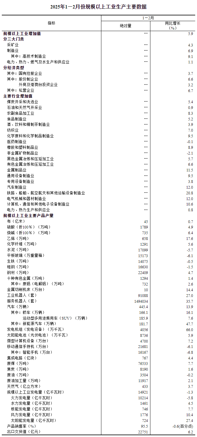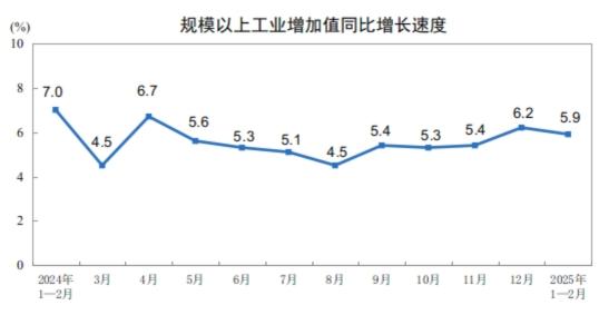 据国家统计局网站消息,1—2月份,规模以上工业增加值同比实际增长5.9%(增加值增速均为扣除价格因素的实际增长率)。从环比看,2月份,规模以上工业增加值比上月增长0.51%。