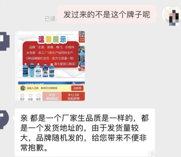 另一款-40℃超强防冻型玻璃水,主页品牌名称为“甄隆”,到手后品牌名称却为“左巽”。对此商家解释称,两种品牌由工厂5条生产线同时生产,随机发货,配方与质量一致。针对此款玻璃水冰点值未达标的情况,该商家未正面回应,仅致歉并提出退款2元。