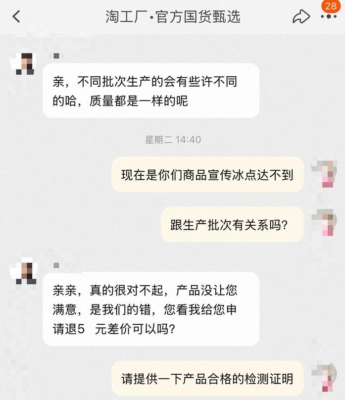 对此,淘工厂·官方国货甄选售后客服回应称,“不同批次生产的会有些许不同,质量都是一样。”随后致歉称,“产品没让消费者满意,为消费者申请5元差价。”官方客服介入处理后,淘工厂官方客服回应称,“淘工厂对于假冒品牌的问题处理非常严格,一旦核实情况属实会全力维护消费者权益并对假冒品牌进行严肃的处置。”并提出退款且无需退货的解决方案。
