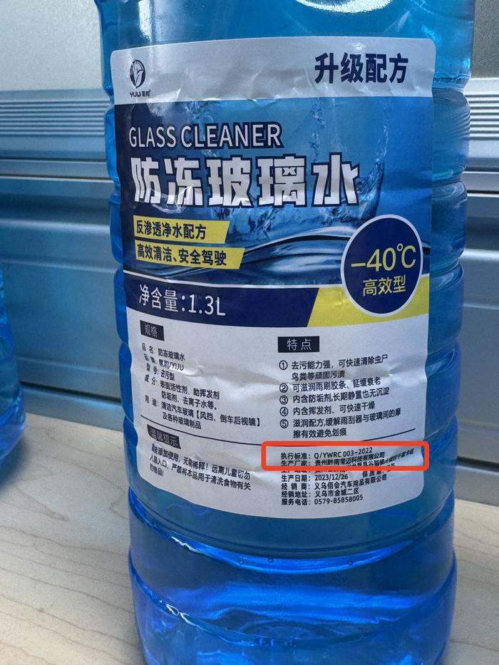 其中,“易驹”品牌防冻型玻璃水执行标准为(Q/YWRC003-2022),业内人士介绍称此款玻璃水或为企业执行标准,“企业标准是企业自定的标准化,若进行过公示可以在网上查到”。